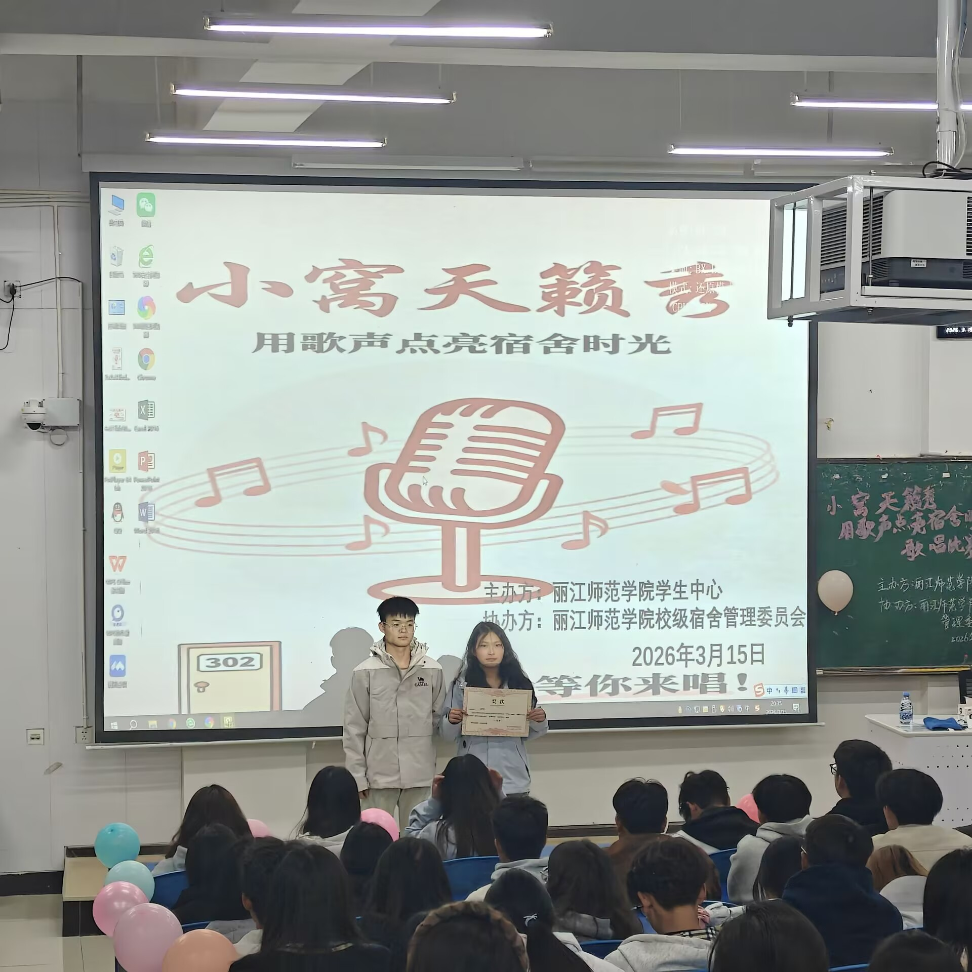 为丰富校园课余文化生活,营造温馨和谐、积极向上的宿舍文化氛围,深化同学间的情谊,充分展现新时代丽师青年学子的青春风采与精神风貌,2026年6月15日下午,学校宿舍管理委员会在博学楼324教室成功举办“小窝天籁秀:用歌声点亮宿舍时光”宿舍歌唱比赛。本次比赛以宿舍为参赛单位,面向全校学生广泛征集参赛选手,吸引了各学院学子踊跃报名参与,选手们以歌声传递温情,以旋律凝聚同心,为校园文化建设注入了鲜活活力。